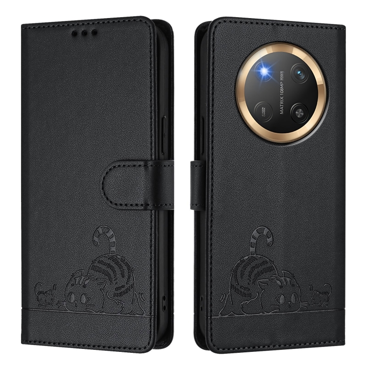 Funda de Cuero Rfid Honor X9C 5G Global con Estampado de Rata y Gato en Relieve y Cordón (Negro)