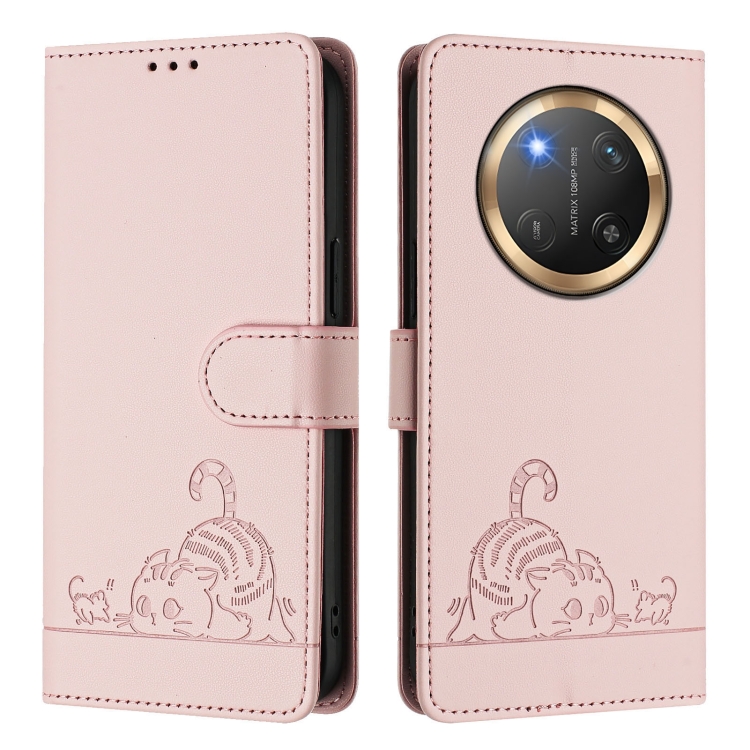 Funda de Cuero Rfid Honor X9C 5G Global con Estampado de Rata y Gato En Relieve y Cordón (Rosa)