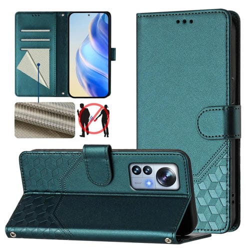 Funda de Cuero Rfid con Relieve de Panal para Xiaomi 12 Pro/12S Pro (Verde Pavo Real)
