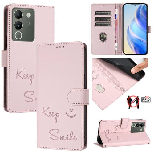 Funda de Cuero Rfid con Relieve de Sonrisa Global para Vivo V29E 5G (Rosa)
