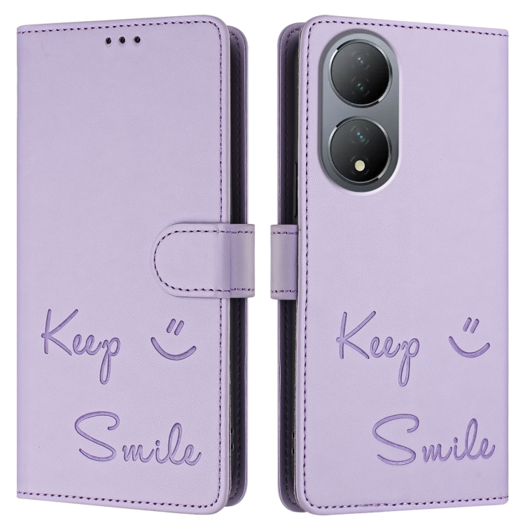 Funda de Cuero Rfid con Relieve de Sonrisa Global para Vivo Y100 5G (Morado Claro)