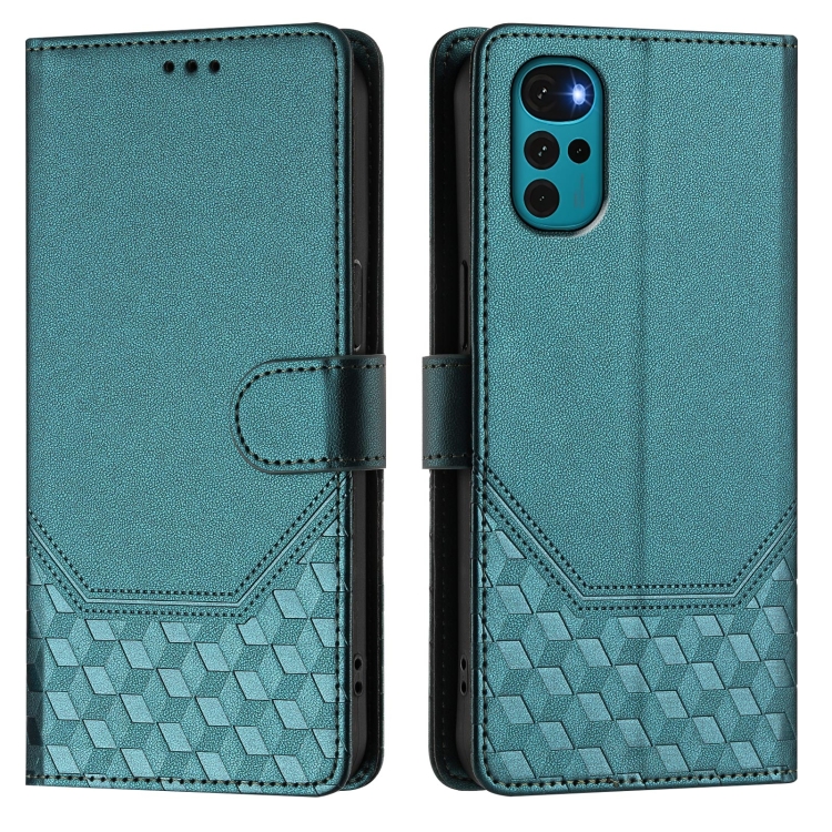 Funda de Cuero Rfid con Relieve en Panal para Motorola Moto E32 India/G22 4G (Verde Pavo Real)