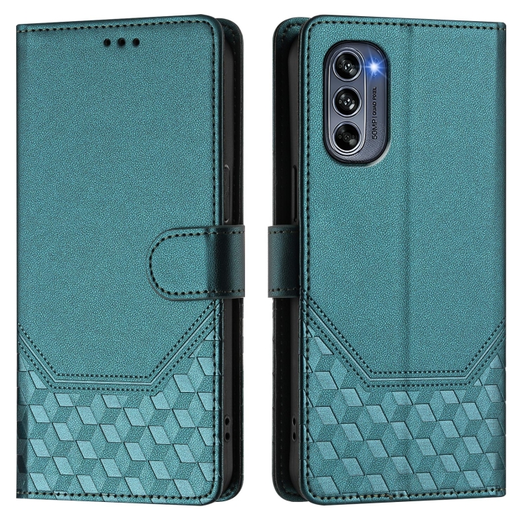 Funda de Cuero Rfid con Relieve en Panal para Motorola Moto G62 5G Global/India (Verde Pavo Real)