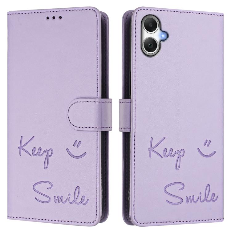 Funda de Cuero Rfid con Relieve Sonriente para Samsung Galaxy A06 5G/4G (Morado Claro)