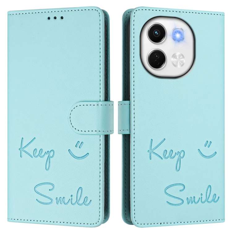Funda de Cuero Rfid con Relieve Sonriente para Tecno Spark 30 5G (Verde Menta)