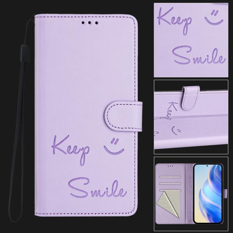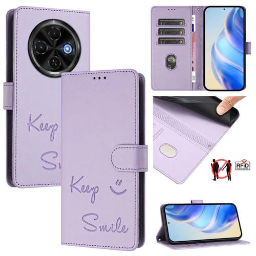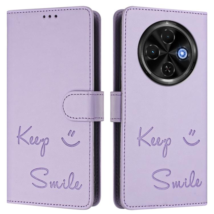 Funda de Cuero Rfid con Relieve Sonriente para Tecno Spark 30C 5G Pop 9 5G (Morado Claro)