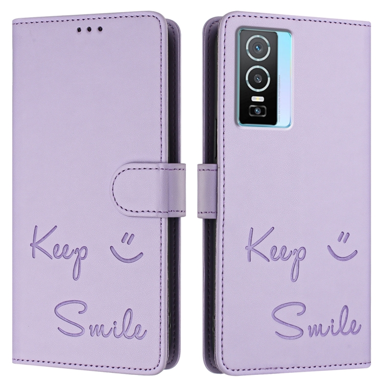 Funda de Cuero Rfid con Relieve Sonriente para Vivo Y76 5G (Morado Claro)