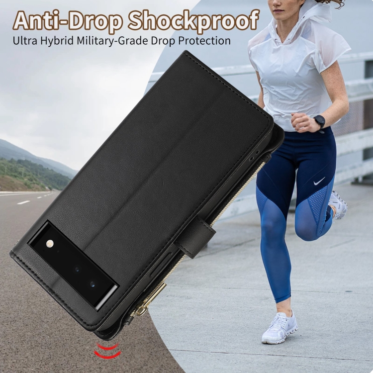 Funda de Cuero Tipo Billetera con Cremallera Rombal para Google Pixel 6 (Negra)