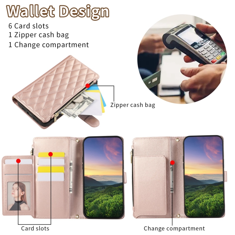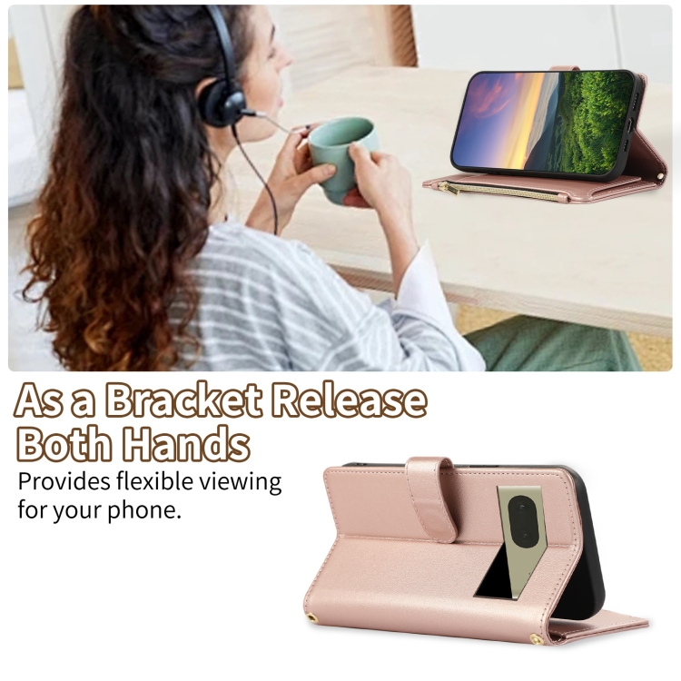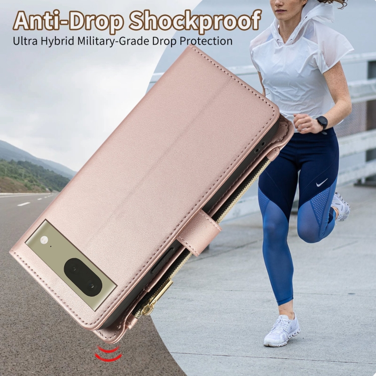 Funda de Cuero Tipo Billetera con Cremallera Rombal para Google Pixel 7 (Oro Rosa)