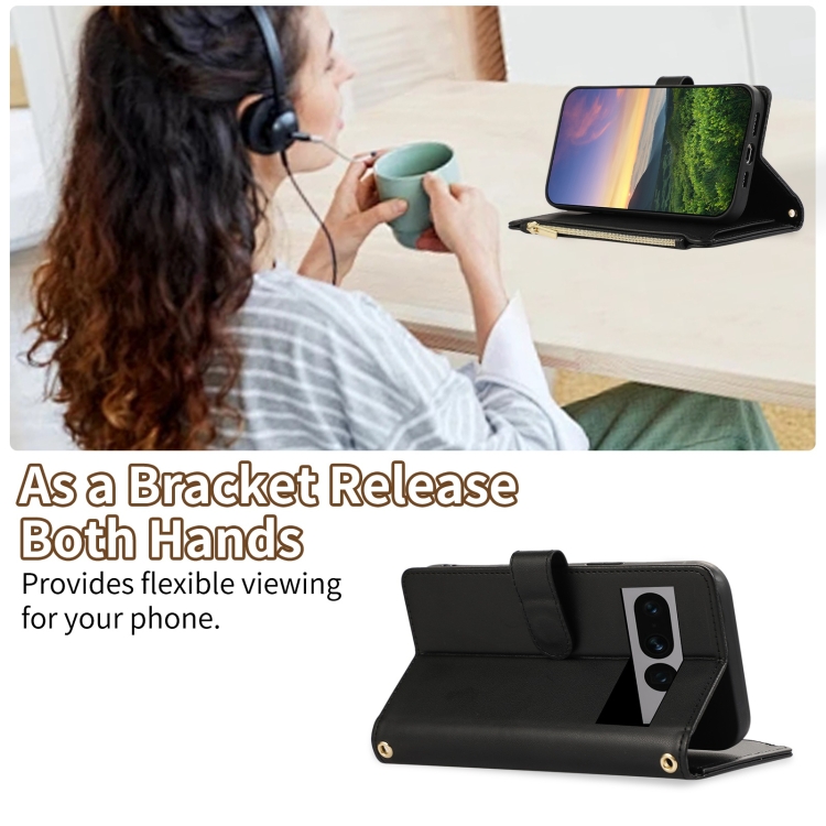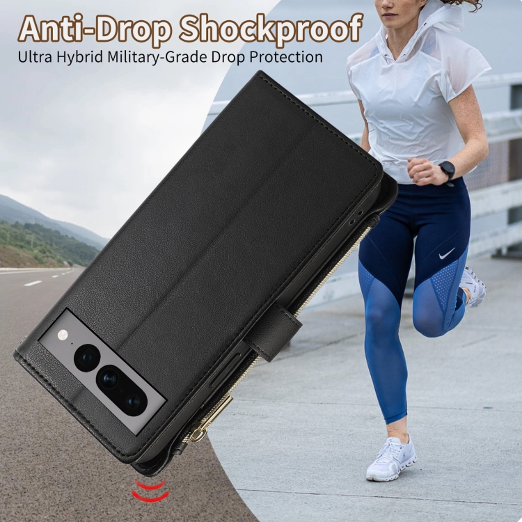 Funda de Cuero Tipo Billetera con Cremallera Rombal para Google Pixel 7 Pro (Negra)