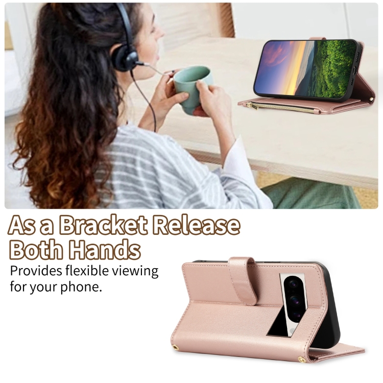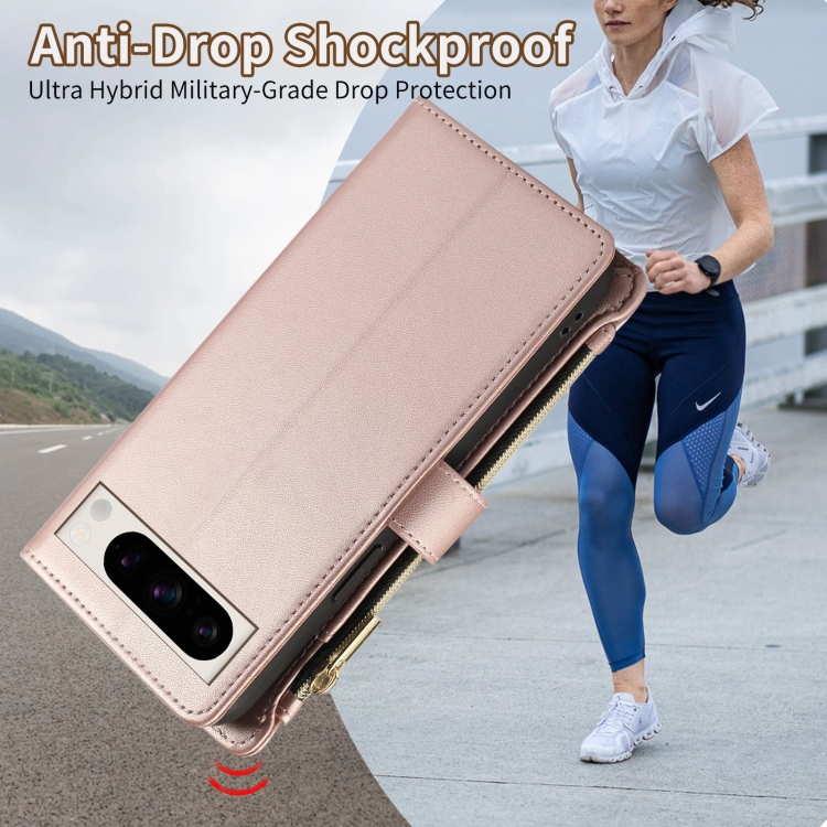 Funda de Cuero Tipo Billetera con Cremallera Rombal para Google Pixel 8 Pro (Oro Rosa)
