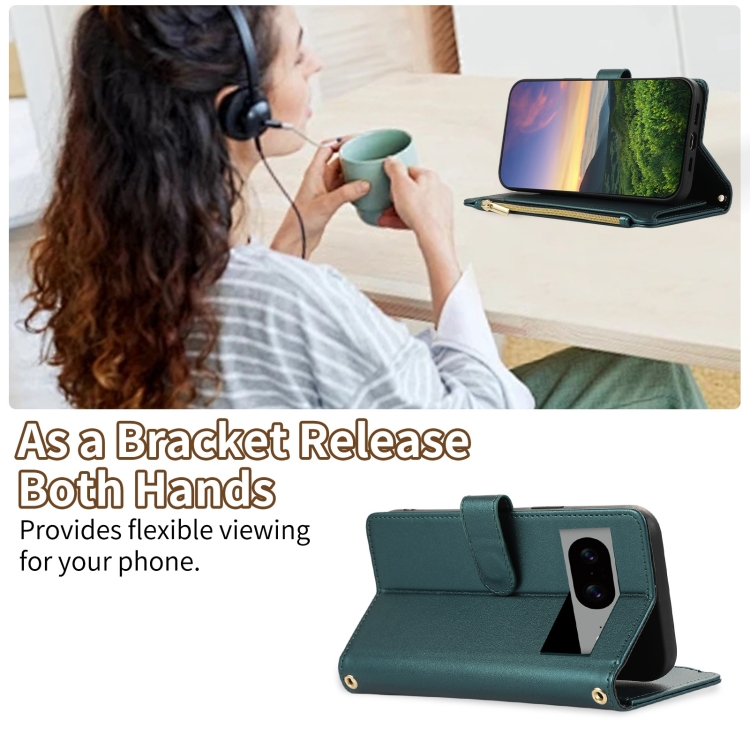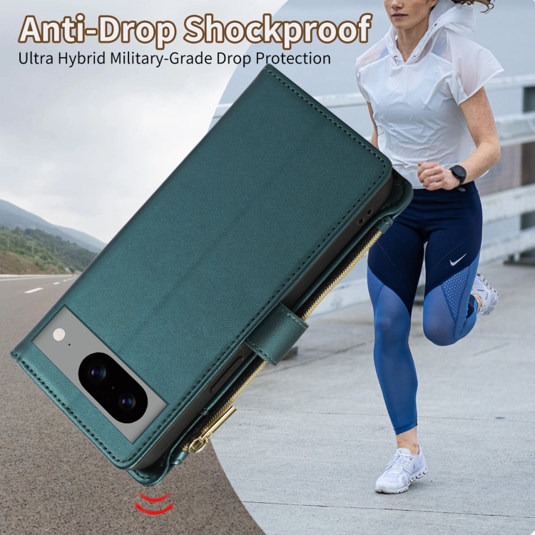 Funda de Cuero Tipo Billetera con Cremallera Rombal para Google Pixel 8 (Verde)