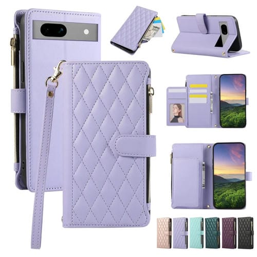 Funda de Cuero Tipo Billetera con Cremallera y Diseño Romboidal para Google Pixel 7A (Morado)
