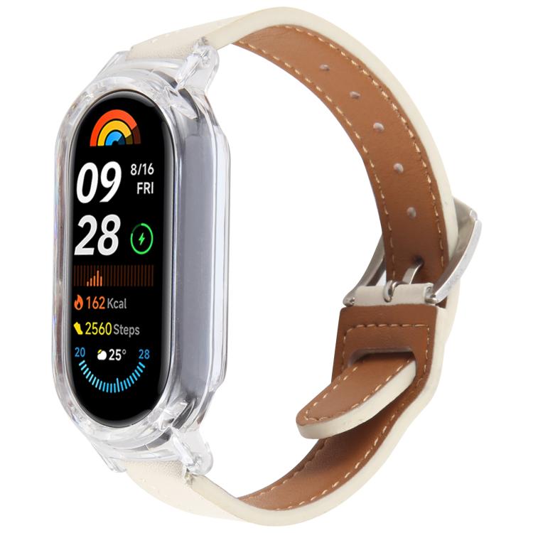 Funda de PC para Xiaomi Smart Band 9 con correa de cuero de microfibra integrada (transparente y beige blanco)