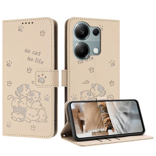 Funda de Piel con Diseño de Gatito En Relieve y Cordón para Xiaomi Poco M6 Pro 4G (Beige)