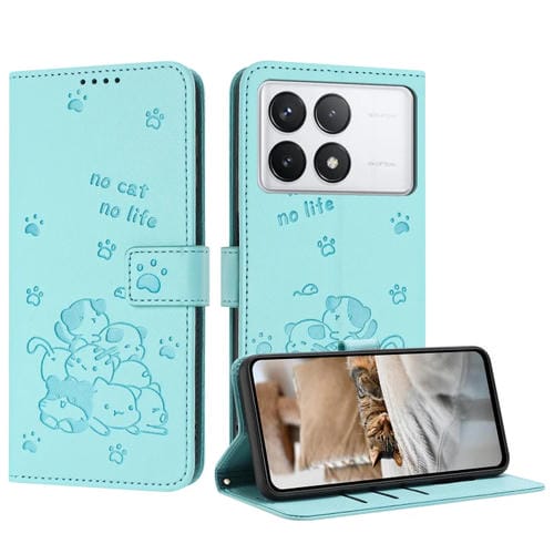 Funda de Piel con Diseño de Gatito En Relieve para Xiaomi Poco X6 Pro con Cordón (Verde Menta)