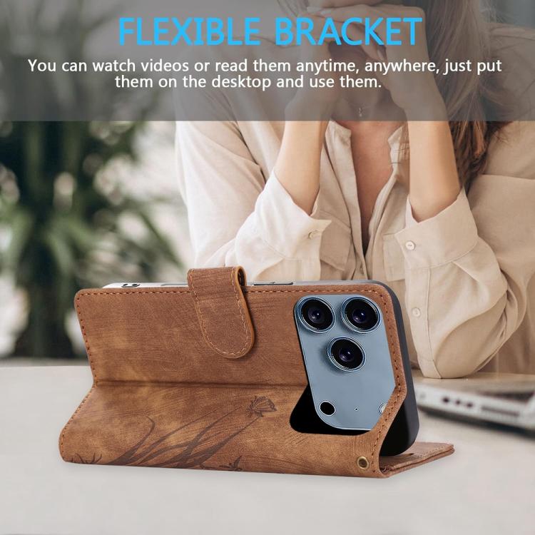 Funda de piel con relieve de mariposa y orquídea para iPhone 17 Pro (marrón)