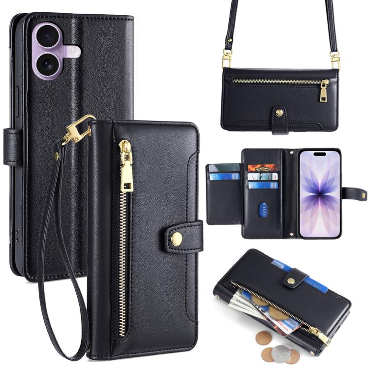 Funda de piel tipo cartera con cremallera y diseño de oveja para iPhone 17 (negra)