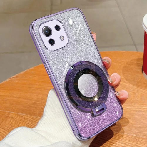 Funda de Teléfono de TPU con Soporte Redondo y Purpurina Degradada Plateada para Xiaomi Mi 11 Lite (Morado)