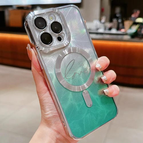Funda de Teléfono TPU Magsafe Dual-Love para iPhone 12 Pro con Purpurina y Degradado de Plumas (Verde)