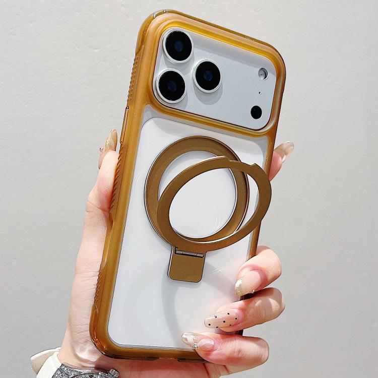 Funda MagSafe para iPhone 17 Pro con borde translúcido y soporte metálico (color café)