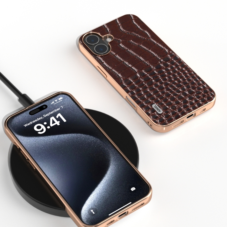 Funda para iPhone 16 Abeel Marco Galvanizado Patrón Cocodrilo Cuero Genuino (Café)