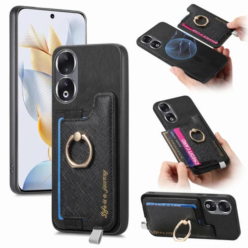 Funda para Teléfono Honor 90 Pro 5G con Tarjetero y Anillo de Cuero Retro Magsafe (Negro)
