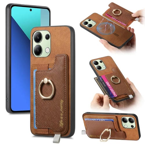 Funda para Teléfono con TaRJetero y Anillo de Cuero con Diseño Retro Magsafe Cross para Xiaomi Redmi Note 13 4G (Marrón)
