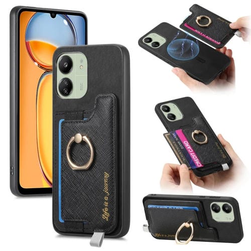 Funda para Teléfono con TaRJetero y Anillo de Cuero con Diseño Retro Magsafe para Redmi 13C / Poco C65 / M6 (Negro)