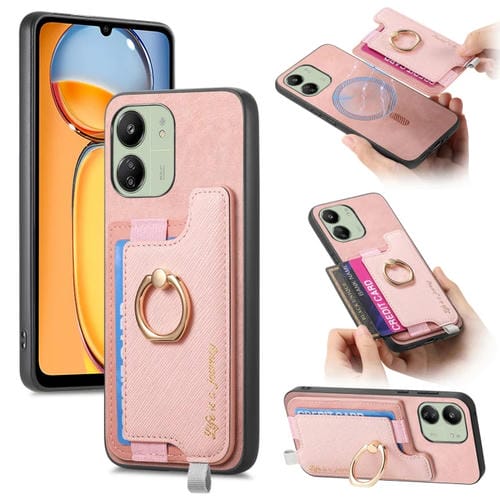 Funda para Teléfono con TaRJetero y Anillo de Cuero con Diseño Retro Magsafe para Redmi 13C / Poco C65 / M6 (Rosa)