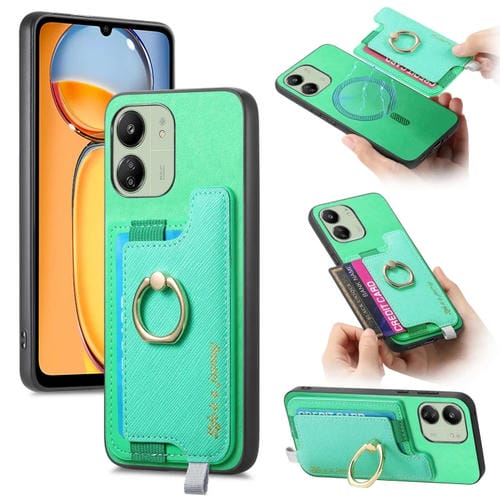 Funda para Teléfono con TaRJetero y Anillo de Cuero con Diseño Retro Magsafe para Redmi 13C / Poco C65 / M6 (Verde)