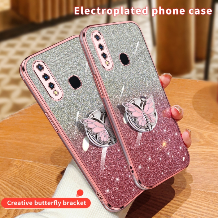 Funda para Teléfono de TPU con Soporte para Mariposas con Purpurina Degradada Plateada para Vivo Y5S (Azul Sierra)