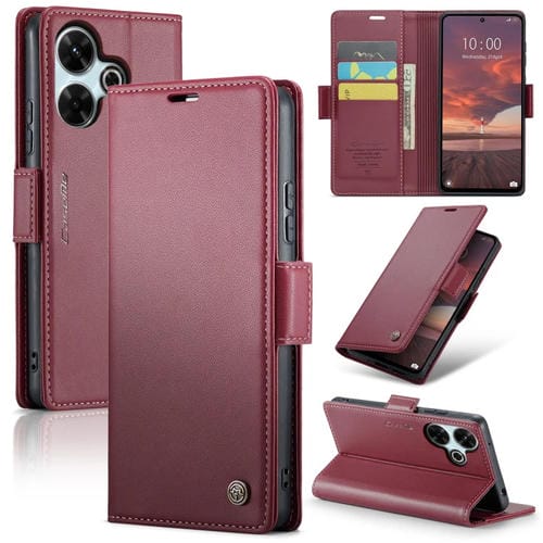 Funda para Teléfono Redmi 13 Caseme 023 con Hebilla de Mariposa y Textura de Lichi, de Cuero Antirrobo Rfid (Rojo Vino)