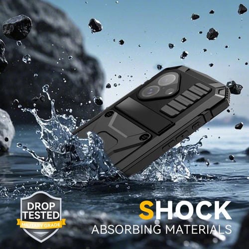 Funda R-JUST de metal, silicona y vidrio templado para iPhone 17, resistente al agua y con soporte (negra)