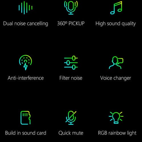 - Micrófono MEMC, reducción de ruido dual MCU, sensibilidad -36±2 dB, impedancia 2.2K, frecuencia 100 Hz - 15 KHz, relación Señal-ruido 50 dB, longitud de Cable 1,5 m, recogida omnidireccional, cinco modos de cambio de voz, iluminación RGB ajustable