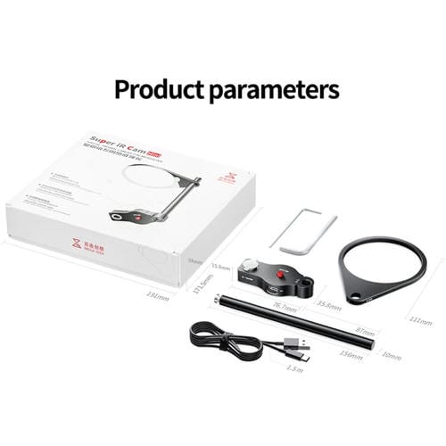 El Paquete contiene la Cámara termográfica, Soporte vertical, Soporte de extensión, Cable tipo C, llaves hexagonales y tornillo para montaje y ajuste.