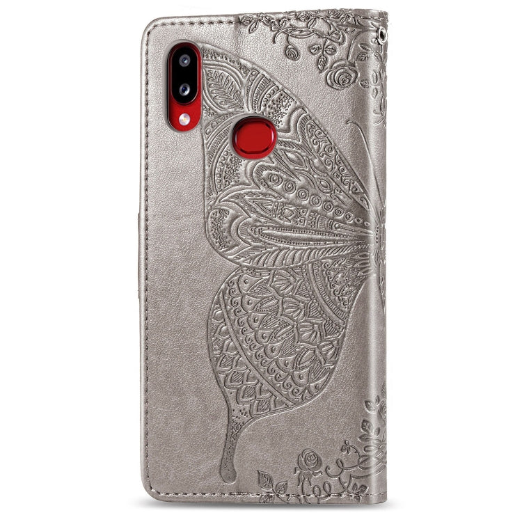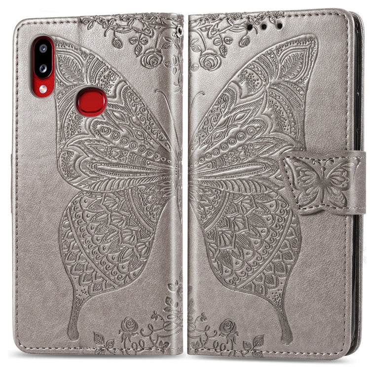 Estuche de Cuero para Galaxy A10S Butterfly Love Flowers con Tapa Horizontal en Relieve, Soporte, Ranuras para Tarjetas, Billetera y Cordón (Gris)