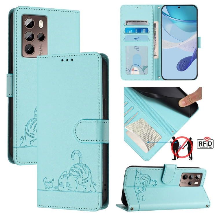 Estuche para Teléfono HTC U24 Pro CAT Rat Cuero Rfid con Patrón En Relieve y Cordón (Verde Menta)