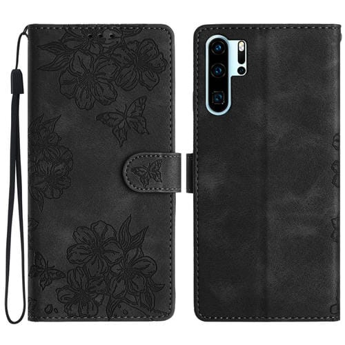 Funda para Huawei P30 Pro Cherry Blossom Butterfly Skin Feel de PU en Relieve (Negro)