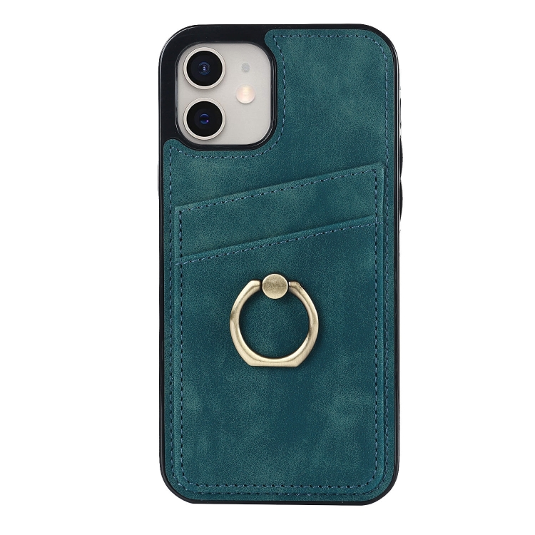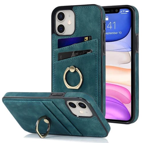 Funda de Teléfono iPhone 11 Cuero Parche Vintage Soporte para Anillo (Azul)