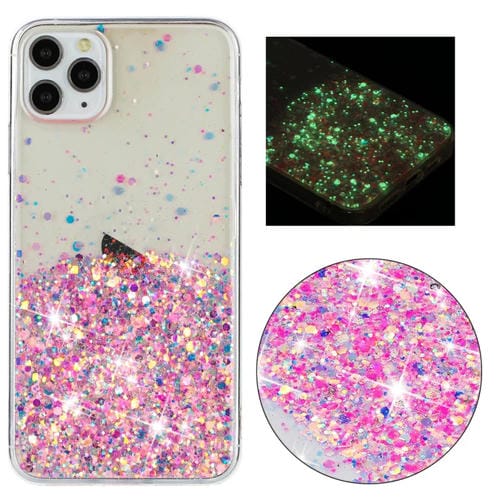 Caja de teléfono TPU iPhone 11 Pro Max con polvo de brillo noctilucente y marco Transparente (Rosa)