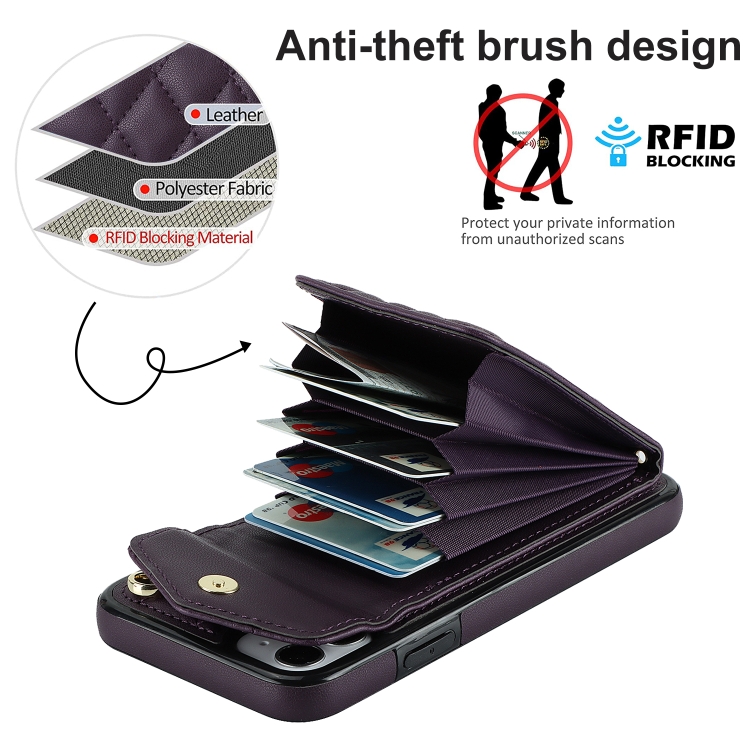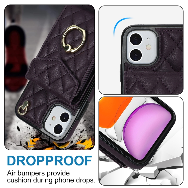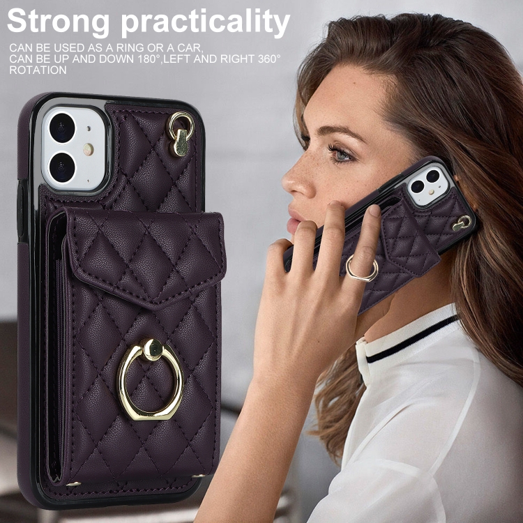 Funda para Teléfono iPhone 11 Rhombic Texture Card Bag con Cordón Largo (Púrpura Oscuro)