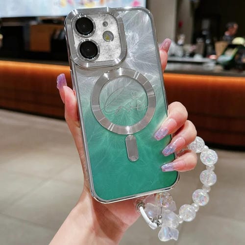 Funda para Teléfono iPhone 12 Magsafe TPU con Pulseras Purpurina Degradado Plumas Doble Amor (Verde)