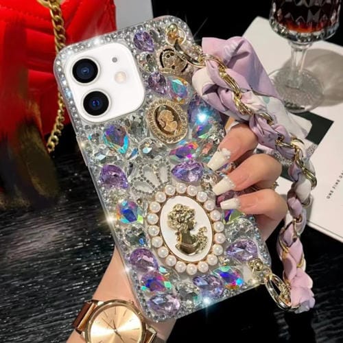 Caja teléfono iPhone 12 Mini PC pulsera bufanda piedra preciosa púrpura diamante hecho a mano (Blanco)