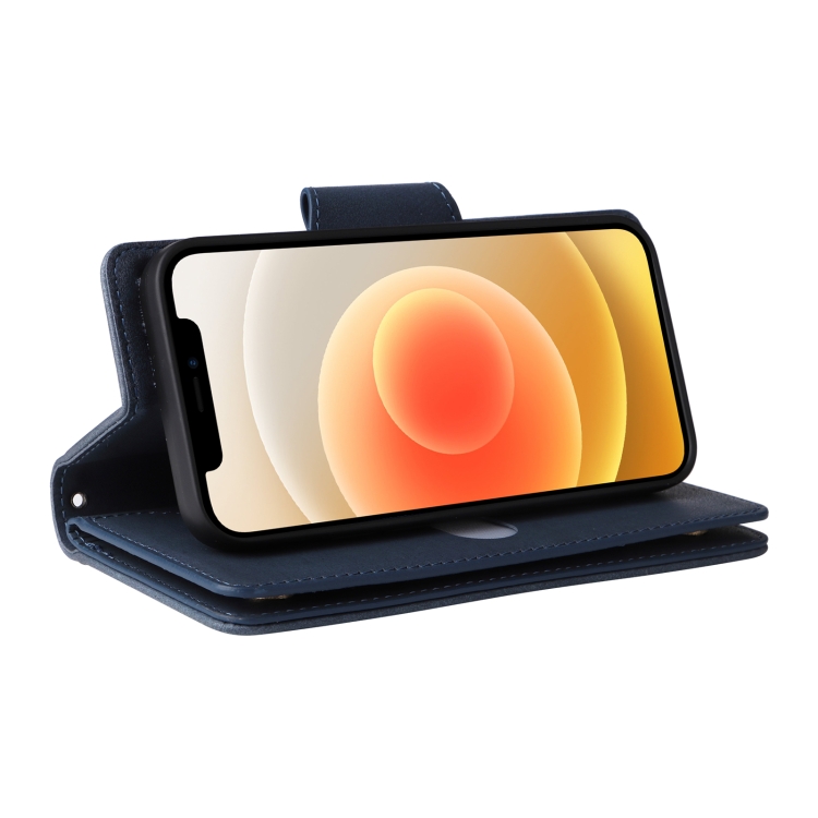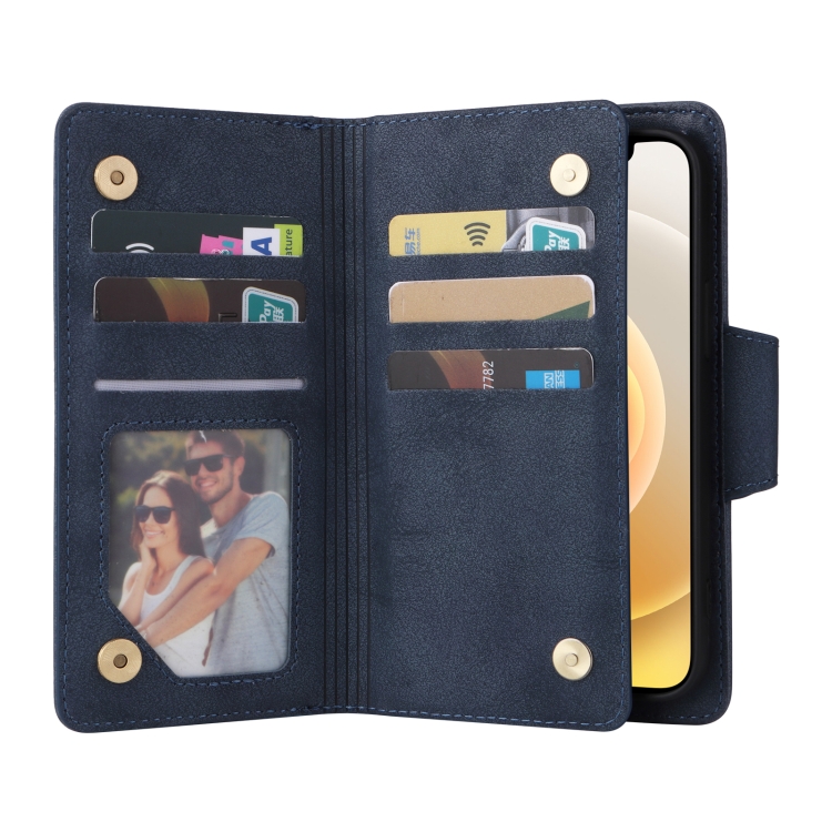 Funda de Cuero para iPhone 12 Mini Rivet Buckle Tres Pliegues 9 Cards (Azul)