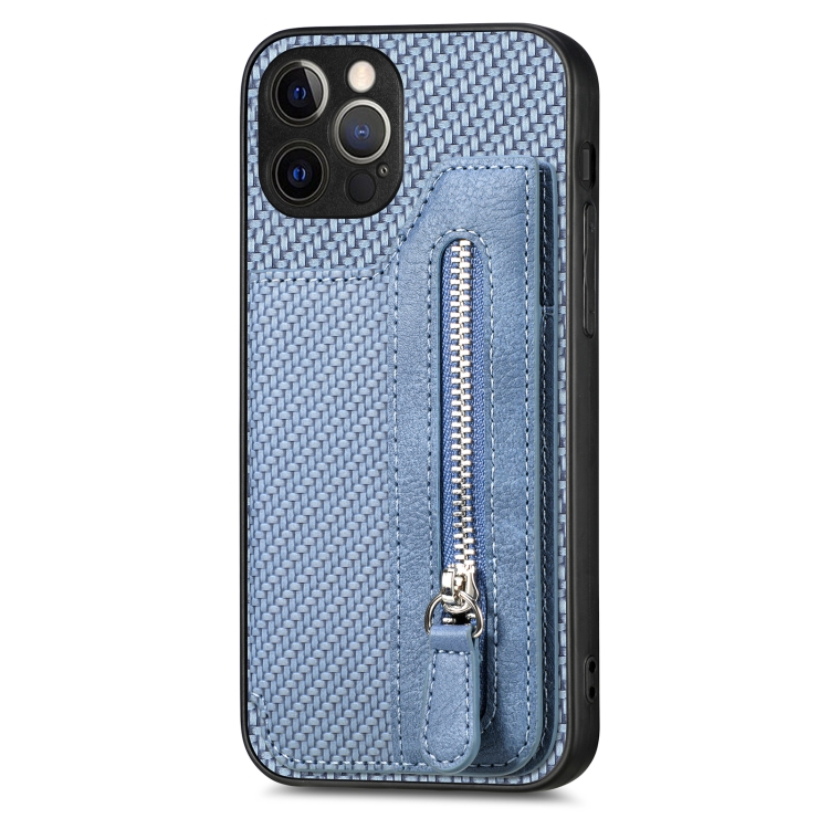Funda para iPhone 12 Pro Max Carbon Fiber Horizontal Flip Zipper Wallet Phone Case (Azul)