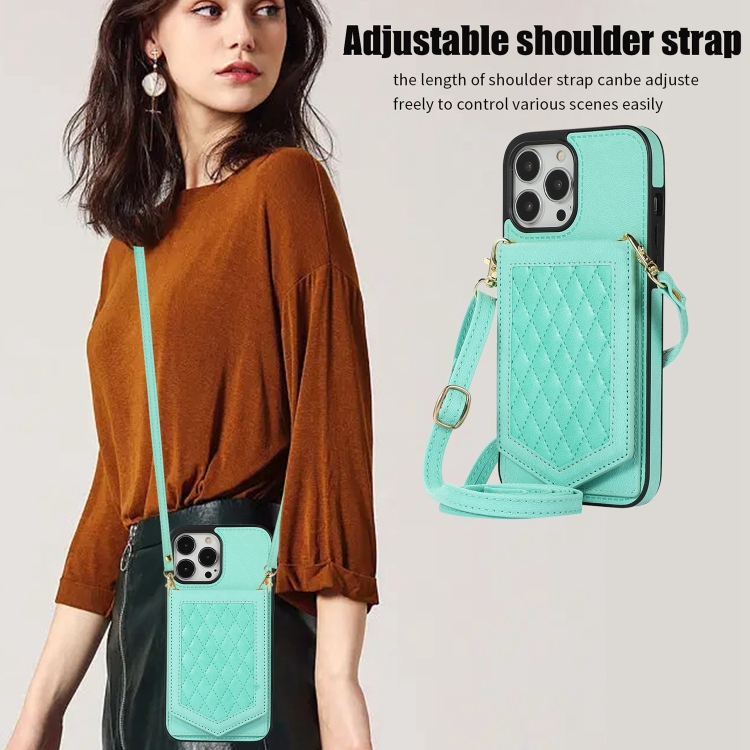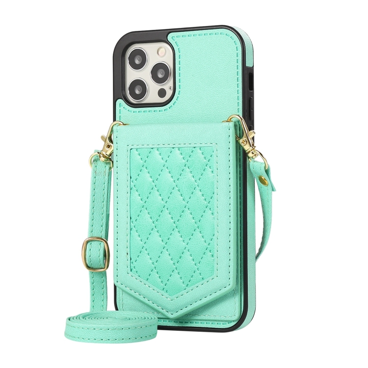 Funda para iPhone 12 Pro Max Rhombic Texture Rfid con Cordón y Espejo (Verde Menta)