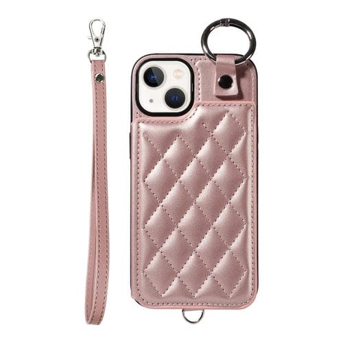 Estuche para teléfono iPhone 13 con bolsa para tarjetas textura rómbica y cordón corto (Oro Rosa)