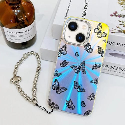 For iPhone 13 Electroplated Laser Butterfly Phone Case with Wrist Strap (AB5 Black Butterflies)