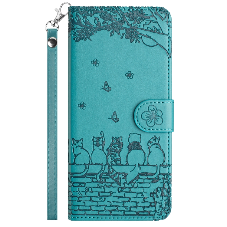 Funda de Cuero iPhone 13 Pro Max Cat Relieve Patrón con Cordón (Azul)